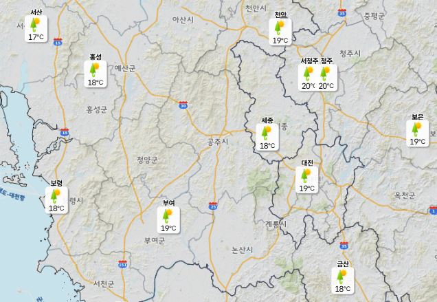 이날 낮 최고기온은 대전 17도, 세종 18도, 청주 20도, 천안 19도로 예보됐고 아침 최저기온은 7도 수준에 머물 것으로 보인다.