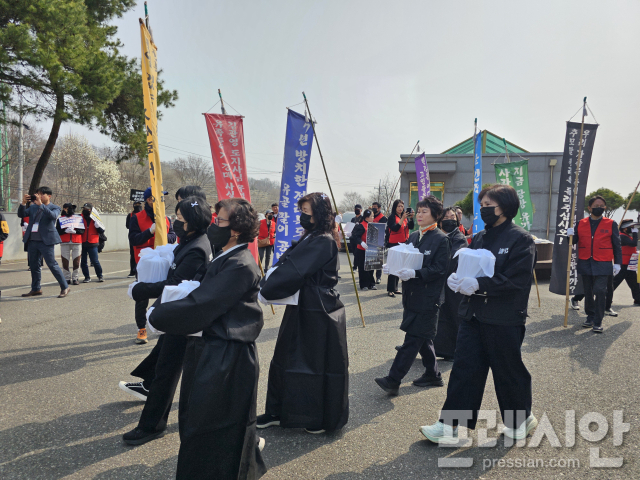 전북 전주 자임추모공원에서 출발한 상여가 27일 도심을 지나 전북도청까지 이어졌다. 유가족들이 직접 상여를 메고 유골함을 들었다. 고인을 보내는 의식이 아니라, 반복된 시설 폐쇄와 추모 제한 속에서 책임을 묻기 위해 거리로 나선 행진이었다.