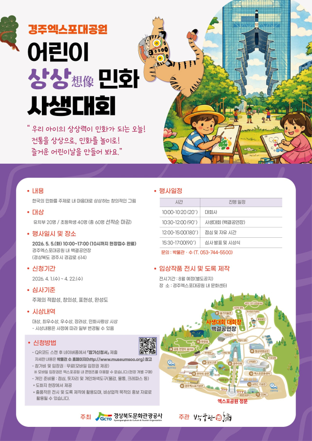 경북문화관광공사는 우리 민화의 아름다움을 현대적으로 계승하고 어린이들에게 창의적인 배움의 기회를 제공하고자, 오는 5월 5일 ‘어린이 상상(想像) 민화 사생대회’를 개최한다.