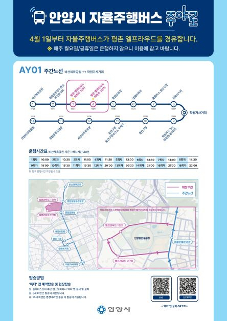 ‘주야로’는 현재 무료로 운영되고 있으며, 경기도 통합교통플랫폼 ‘똑타’ 앱을 통한 사전 예약 또는 정류장에서 즉시 탑승이 가능하다. 포털 지도나 버스 정보 앱에서 노선번호 ‘AY01’을 검색하면 실시간 위치도 확인할 수 있다. 다만 안전을 위해 6세 미만 영유아는 탑승이 제한되며, 14세 미만은 보호자 동반이 필요하다.