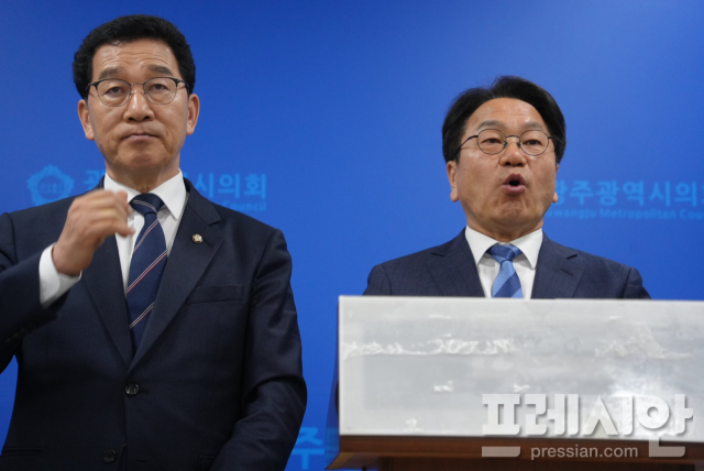 ▲1일 광주시의회 브리핑룸에서 열린 군 공항 예비이전후보지 선정 관련 기자회견에서 강기정 민주당 전남광주특별시장 전 예비후보(우)가 발언하고 있다.2026.04.01ⓒ프레시안(김보현)