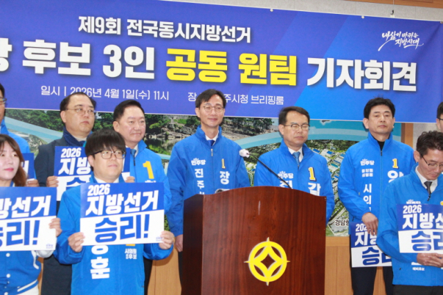 갈상돈·장문석·최구식 더불어민주당 진주시장 예비후보가 경선 후보 원팀을 선언했다. 세 예비후보는 1일 진주시청 브리핑룸에서 기자회견을 열고 "후보 원팀으로 진주 정권교체를 이뤄내겠다"고 밝혔다.
