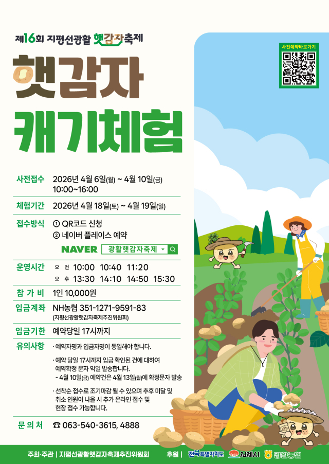 지평선광활햇감자축제추진위원회는 오는 18일부터 19일까지 양일간 개최되는‘제16회 지평선광활햇감자축제’의 인기 프로그램인 ‘광활햇감자 캐기 체험’ 사전 예약을 오는 6일부터 10일까지 진행한다고 밝혔다.