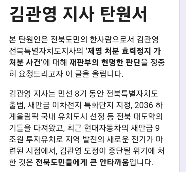 탄원서는 "김관영 지사가 민선 8기 동안 전북특별자치도 출범, 새만금 이차전지 특화단지 지정, 2036 하계올림픽 국내 유치도시 선정 등 전북 대도약의 기틀을 다져왔다"며 "최근 현대자동차의 새만금 9조원 투자유치로 지역발전의 새로운 전기가 마련된 시점에서 김관영 도정이 중단될 위기에 처한 것은 전북도민들에게 큰 안타까움"이라고 말했다.