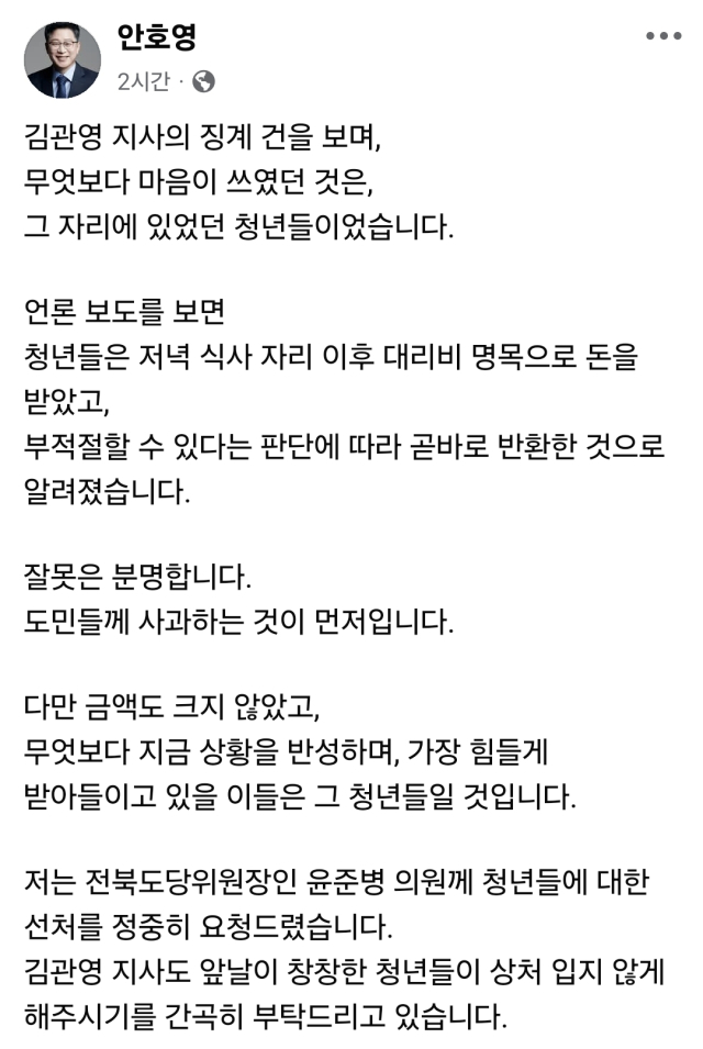 안호영 의원은 4일 자신의 SNS를 통해 "김관영 지사의 징계 건을 보며, 무엇보다 마음이 쓰였던 것은, 그 자리에 있었던 청년들이었다"면서 "무엇보다 반성하며, 가장 힘들게 받아들이고 있을 이들은 그 청년들"이라고 언급했다.