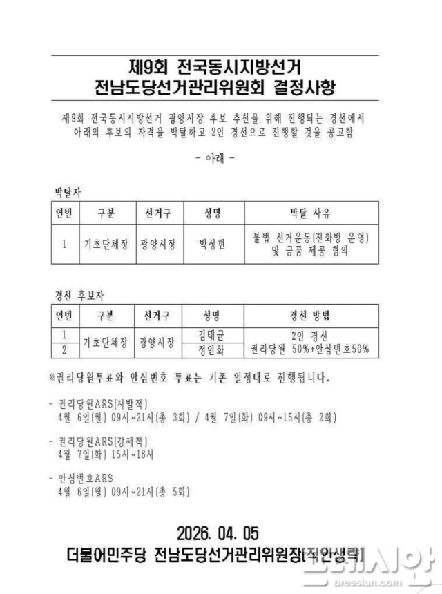 아울러 "전남도당의 신속하고 엄정한 결정에 따라, 예정된 경선 일정은 변동 없이 차질 없이 진행될 예정"이라며 "이번 일로 시민 여러분과 당원 동지 여러분께 심려를 끼쳐드린 점에 대해 깊이 사과드린다"고 고개를 숙였다.