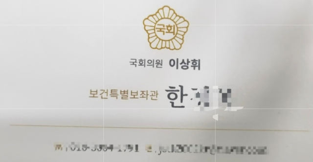 문제의 인물은 한 모씨로, 그는 국회 마크가 새겨진 명함에 ‘국회의원 이상휘, 보건특별보좌관 한〇〇’라고 표기하고 있다.