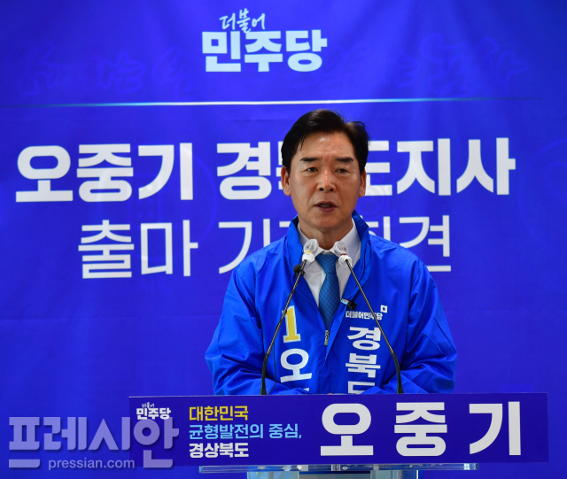 오중기 더불어민주당 경북도지사 예비후보가 지난 6일 국회 소통관과 경북도의회에 이어 7일 포항시청 브리핑룸에서 기자회견을 열고 도지사 선거 출마를 공식 선언했다.