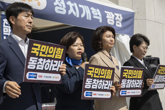▲국회 정치개혁특별위원회 위원인 정춘생 조국혁신당 의원을 비롯한 개혁 진보4당 대표자들이 8일 서울 여의도 국회 본청 앞 정치개혁 천막 농성장에서 국민의힘의 정개특위 1소위 개최 거부를 규탄하는 긴급 기자회견을 열고 있다. 2026.04.08ⓒ연합뉴스