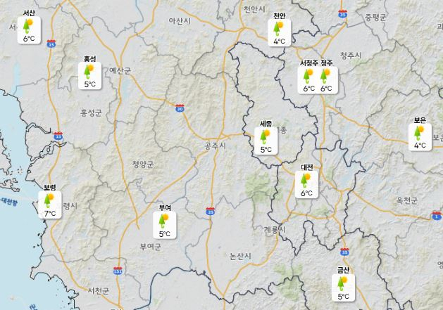이날 낮 최고기온은 대전·세종·청주·천안 15도, 아침 최저기온은 4도 안팎으로 전날보다 다소 낮아질 것으로 예상된다.