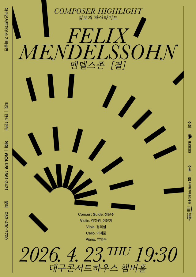 대구콘서트하우스 박창근 관장은 “이번 공연은 멘델스존 음악 속 섬세한 결을 따라가며, 구조적 아름다움과 서정성을 깊이 느낄 수 있는 시간이 될 것”이라며 “해설과 함께하는 구성으로 관객들이 클래식 음악을 보다 친근하게 체험하길 바란다”고 전했다.