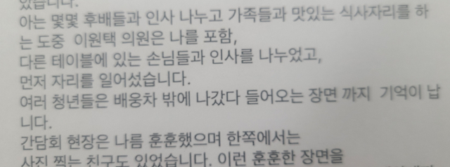 A씨는 "여러 청년들은 배웅차 밖에 나갔다 들어오는 장면까지 기억이 난다"며 "간담회 현장은 나름 훈훈했으며 한쪽에서는 사진 찍는 친구도 있었다"고 상기했다.