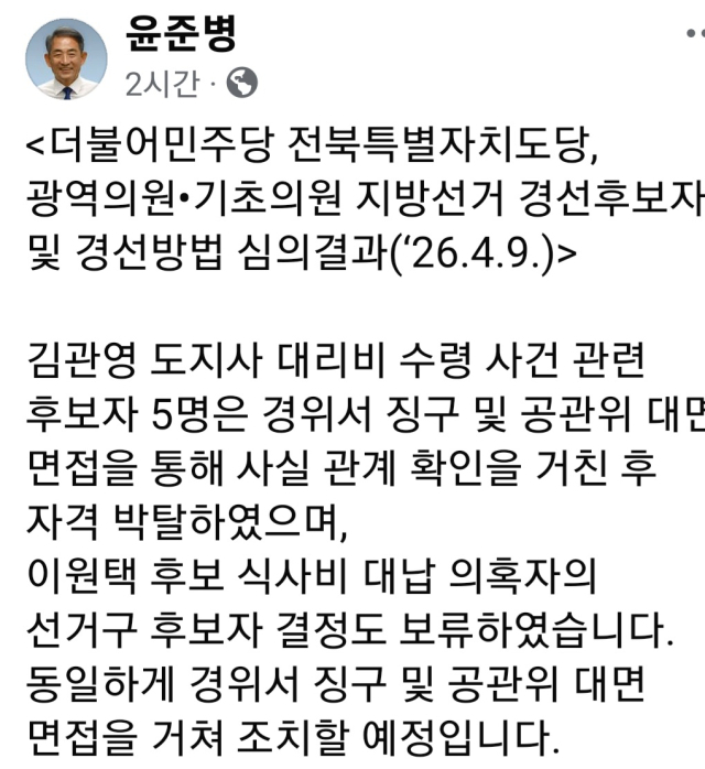 윤준병 민주당 전북도당위원장은 이날 페이스북에 '광역의원·기초의원 지방선거 경선후보자 및 경선방법 심의 결과'를 발표하고 "김관영 도지사 대리비 수령 사건 관련 후보자 5명은 경위서 징구 및 공관위 대면 면접을 통해 사실 관계 확인을 거친 후 자격 박탈했다"고 밝혔다.
