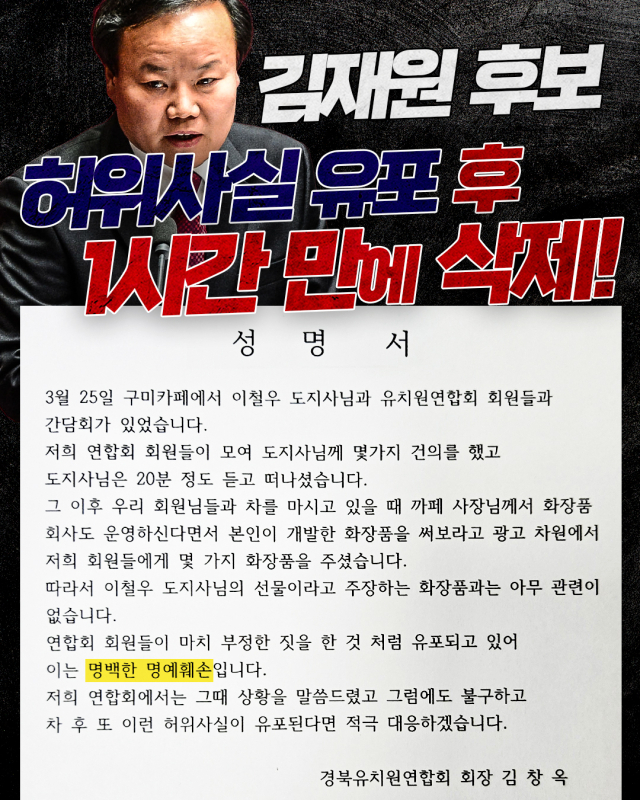 경상북도유치원연합회가 국민의힘 경북도지사 경선 과정에서 불거진 ‘고가 화장품 제공’ 의혹에 대해 “사실과 전혀 다르다”며 공식 성명을 통해 정면 반박했다. 해당 의혹은 김재원 예비후보의 SNS 게시물에서 촉발됐으며, 정치권 공방으로 확산되는 양상이다.