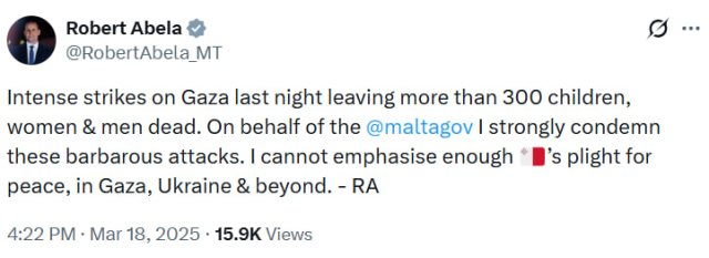 로버트 아벨라 몰타 총리는 지난해 3월 자신의 X에 글을 올려 "몰타 정부를 대표해 (이스라엘의) 야만적인 공격을 강력히 규탄한다"며 "가자지구와 우크라이나, 그리고 그 너머의 평화를 향한 몰타의 간절한 염원을 다시 한번 강력히 강조한다"고 밝혔다.