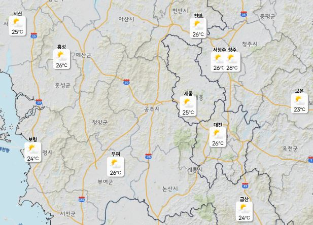 이날 낮 최고기온은 대전·세종 25도, 청주·천안 26도까지 오르겠으며 아침 최저기온은 9도로 예상된다.