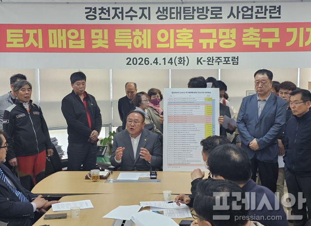 K-완주포럼은 14일 완주군청 브리핑룸에서 기자회견을 열고 ‘산수인 국가생태탐방로 조성사업’과 관련해 특정 법인의 토지 매입 시점과 공공사업 추진 과정이 맞물린 점에 의문을 제기했다.