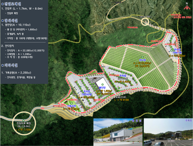 사업비는 기반공사(진입로 확․포장) 포함하여 433억원 정도 소요될 것으로 예상되었다. 또한, 공간배치는 아래쪽부터 가족공원, 봉안당 및 주차장, 잔디장지순으로 배치하는 것이 공간효율이 극대화되는 것으로 평가되었다.