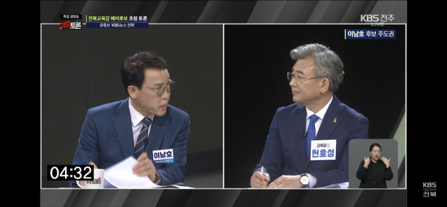 전북교육감 선거 TV토론에서 천호성 예비후보와 이남호 예비후보가 단일화와 도덕성 문제를 놓고 충돌했다.