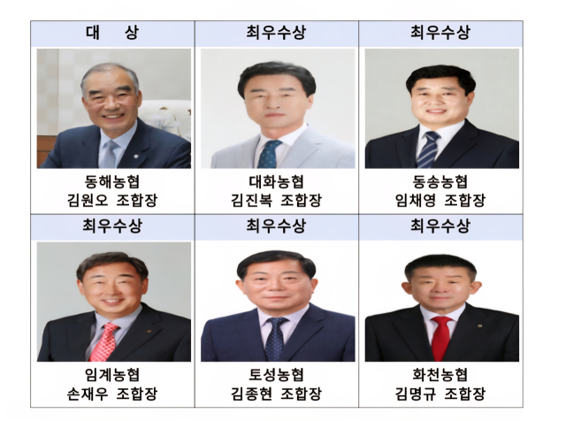 사무소 부문에서는 ▲대상 동해농협(조합장 김원오), ▲최우수상 대화농협(조합장 김진복)·동송농협(조합장 임채영)·임계농협(조합장 손재우)·토성농협(조합장 김종현)·화천농협(조합장 김명규) 등 6개 농·축협이 수상의 영예를 안았다.