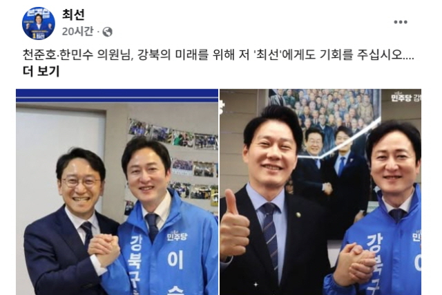 강북구청장 경선 결선 진출자인 최선 전 시의원(전 이재명 정부 청와대 행정관)은 16일 강북갑·을 지역구 국회의원인 천준호·한민수 의원이 자신의 경쟁 상대인 이승훈 변호사(전 민주당 전략기획위 부위원장. 전 부대변인)를 일방적으로 지원하고 있다며 이들을 당 선관위에 제소했다고 밝혔다.