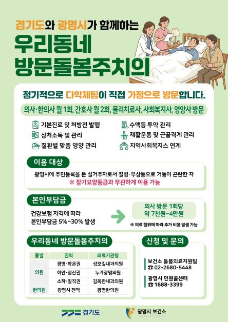 한편 ‘우리동네 방문돌봄주치의 사업’은 오는 12월까지 운영되며, 신청은 이날부터 광명시 보건소 돌봄의료지원팀 방문 또는 전화(02-2680-5448)로 가능하다. 자세한 사항은 광명시 보건소 돌봄의료지원팀, 광명시 민원콜센터(1688-3399) 또는 각 동 행정복지센터로 문의하면 된다.