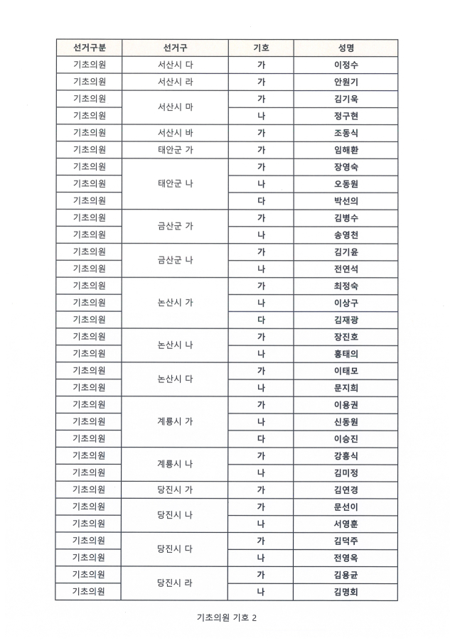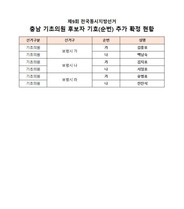 추가 확정에서는 보령지역 일부 선거구 기호가 새로 배정됐다. 보령시 ‘가’ 선거구는 김종호(가)·백남숙(나), ‘나’ 선거구는 김지호(가)·서정호(나), ‘라’ 선거구는 유병호(가)·전진석(나) 후보로 각각 확정됐다.