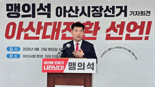 맹의석 국민의힘 아산시장 후보가 21일 아산시청 브리핑룸에서 출마를 공식 선언하고 ‘아산 대전환’과 ‘공정시정’을 핵심 비전으로 제시했다.