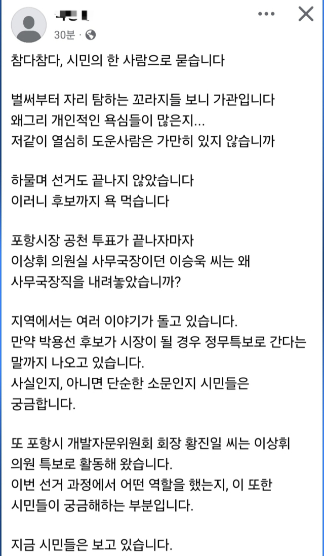 실제로 지역 온라인 커뮤니티와 SNS에서는 “선거도 끝나지 않았는데 벌써 자리 이야기냐”, “시민보다 내부 공신 챙기기에 급급한 것 아니냐”는 비판이 이어지고 있다.