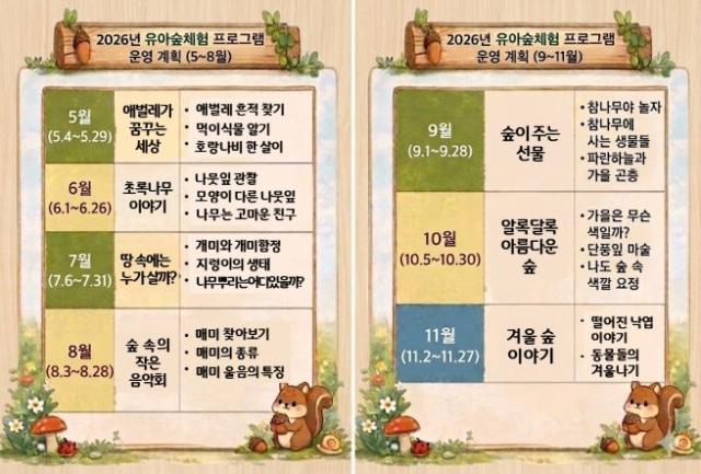유아숲체험원 프로그램은 4월부터 11월까지 성주산 둥지(소사), 원미산 산울림(원미), 은데미(오정) 등 3곳에서 운영된다. 회당 20명 이내 소규모로 진행되며, 운영 시간은 오전 9시 30분부터 11시 30분까지 2시간, 참가비는 무료다.