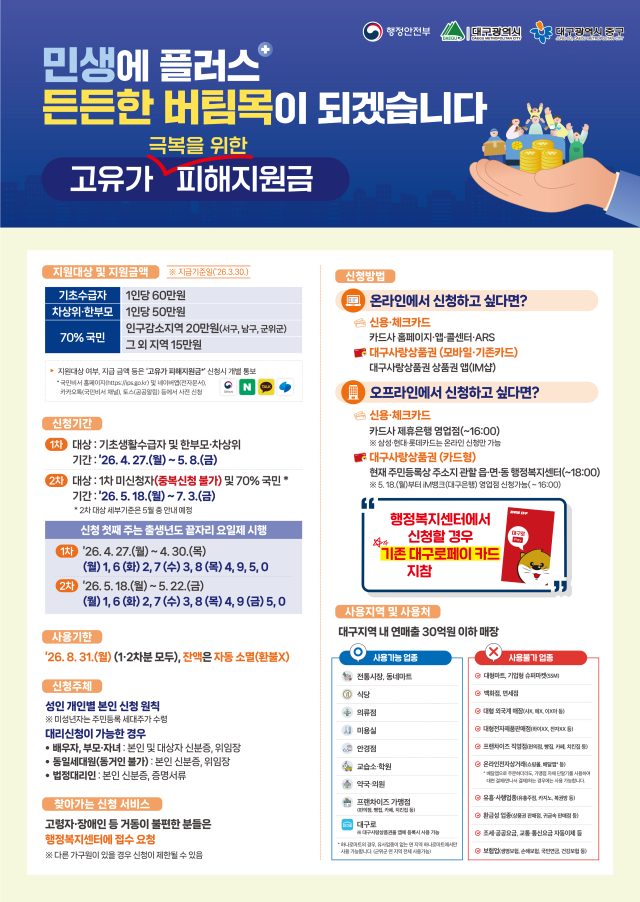 행정복지센터 신청 시 기존 대구로페이카드를 지참해야 하며, 미보유자는 신규 카드를 지급할 예정이다.