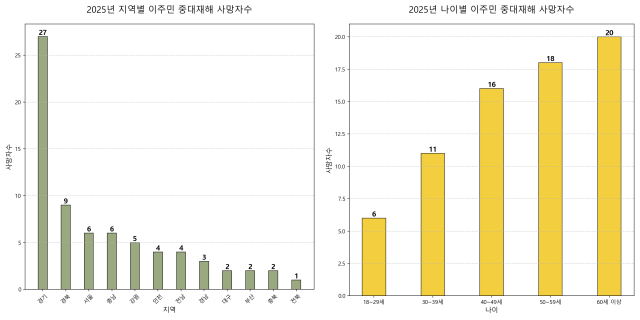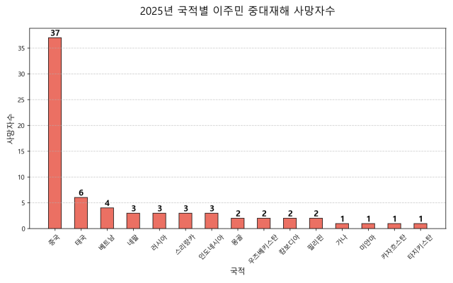 중대재해 사망자의 국적 비율은 취업자 국적 비율과는 다소 어긋난다. 국가데이터처에 따르면 지난해 5월 기준 한국 내 외국인 취업자는 약 111만 9000명으로, 중국 국적 39만 5000명(30.2%, 한국계 중국인 34만 1000명 포함), 베트남 국적 14만 9000명(13.4%), 기타 아시아 국적 48만 3000명(43.5%), 아시아 외 국적 8만 명(7.2%)였다. 다만 이 통계는 표본조사를 바탕으로 한 것이라 미등록 이주노동자가 과소집계됐을 수 있다.