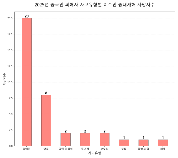 중국 국적 사망자 37명의 사고유형을 보면, 떨어짐이 20건, 맞음이 8건으로 높은 비중을 차지했다. 깔림 사고와 무너짐 및 부딪힘 사고도 각 2건씩 집계됐다.