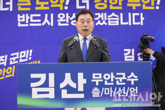 경찰이 수사하는 김산 후보의 혐의는 지난달 31일 이뤄진 출마 기자회견이다. 현직 군수인 김산 후보는 당시 예비후보 등록을 하지 않고 무안군청 3층 회의실에서 기자회견을 열었으며, 현장에서 확성기를 이용한 연호와 함께 지지자들이 기자를 폭행하는 사건까지 발생해 사전선거운동 및 공정성 논란이 촉발됐다.