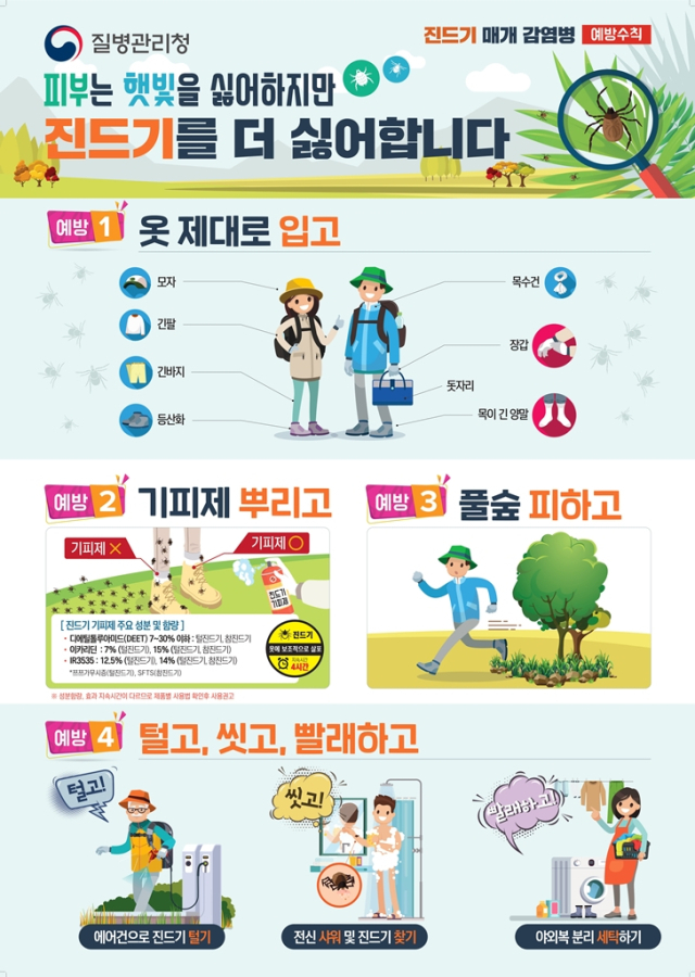 의정부 보건소는 ▲야외활동 시 긴팔·긴바지 착용 등 피부 노출 최소화 ▲진드기 기피제 사용 ▲풀밭 접촉 최소화 ▲야생동물과의 접촉 자제 ▲귀가 후 즉시 샤워 및 의복 세탁 ▲진드기 부착 여부 확인 등 예방수칙을 철저히 준수할 것을 당부했다.