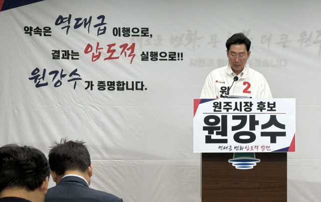 ▲공약 발표하는 원강수 국민의힘 원주시장 후보. ⓒ원강수 국민의힘 원주시장 후보