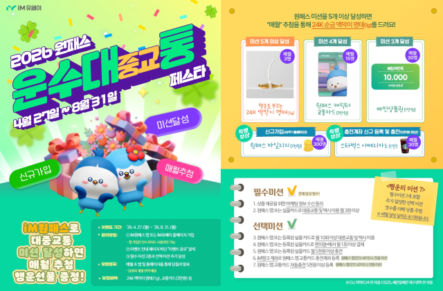 iM금융그룹 계열사인 iM유페이는 고유가 시대 대중교통 이용 활성화를 위해 ‘2026 운수대통 페스타’ 프로모션을 4월 27일~8월 31일까지 4개월간 실시한다고 밝혔다.