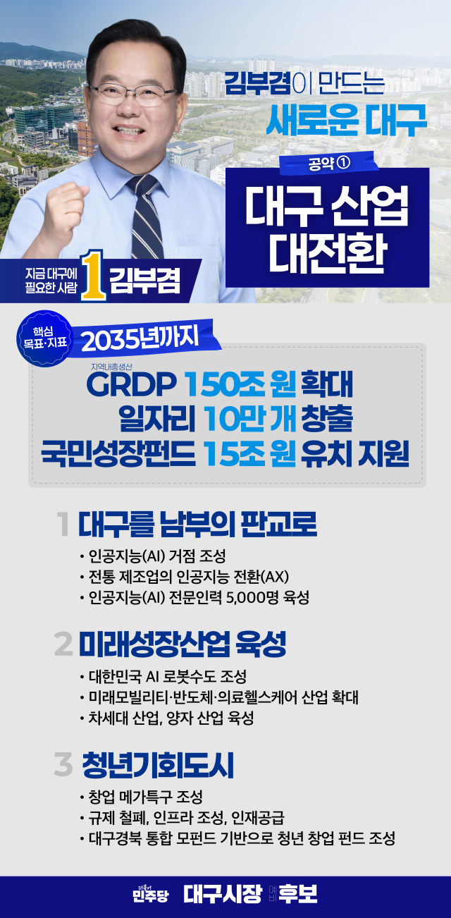 한편 이에 앞서 김 후보는 1차 공약으로 '대구산업과 일자리', 2차 공약으로 '대구경북행정통합과 대구경북신공항'을 내놓은데 이어, 3차 공약은 소상공인과 골목상권의 자영업자들을 위한 '민생경제'에 집중했다.