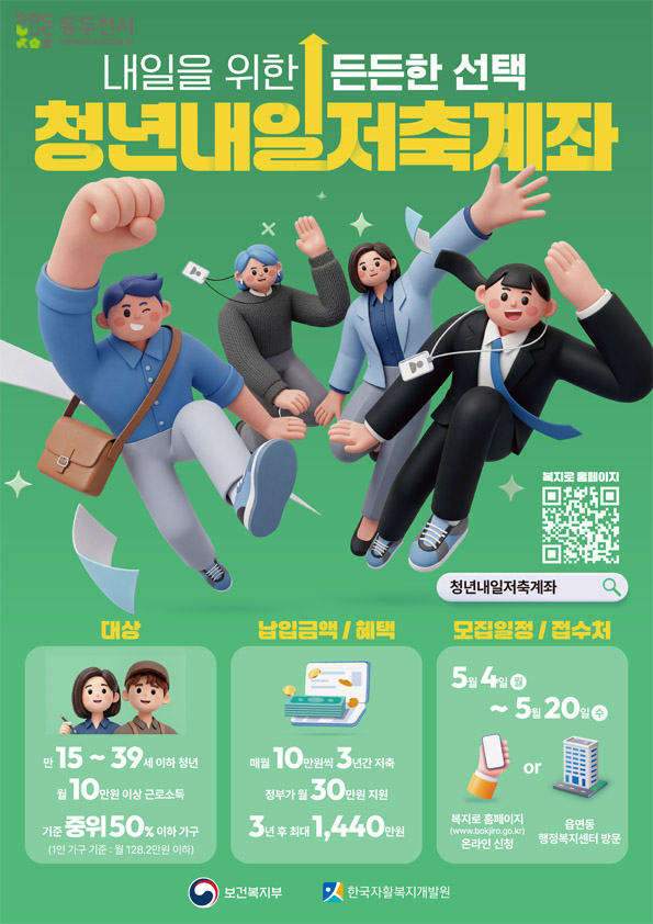 동두천시는 5월 4일부터 20일까지 일하는 청년의 자산 형성을 지원하기 위해 ‘청년내일저축계좌’ 신규 가입자를 모집한다.