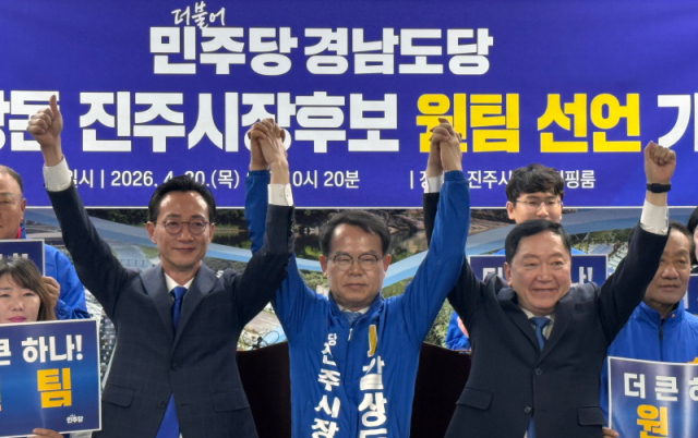 더불어민주당 경남 진주시장 원팀(갈상돈·최구식·장문석)이 30일 진주시청 브리핑룸에서 기자회견을 열고 진주의 정권교체와 새로운 도약을 위한 원팀 체제가동을 공식 선언했다.