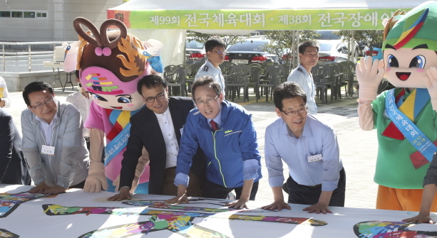 전북도는 5일 올해 개최하는 제99회 전국체육대회(10.12∼10.18) 및 제38회 전국장애인체육대회(10.25∼29)의 성공적인 개최를 위해 전북도청 앞 홍산중앙로와 도청일원에서 'D-99일 기념행사'를 개최했다.