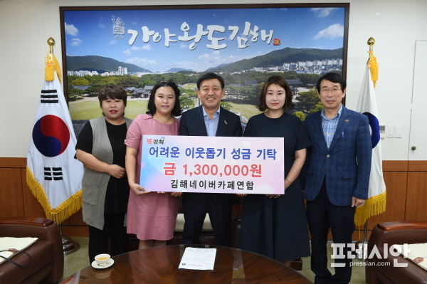 김해네이버카페연합은 10일 경남 김해시청(시장집무실)을 방문, 허성곤 시장에게 어려운 이웃을 돕는데 써달라며 성금 130만원을 기탁했다.