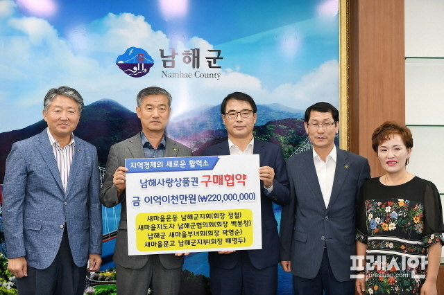 경남 남해군과 새마을운동남해군지회는 18일 군청 군수실에서 연간 2억2000만 원 상당의 남해사랑상품권 구매 협약을 체결했다.