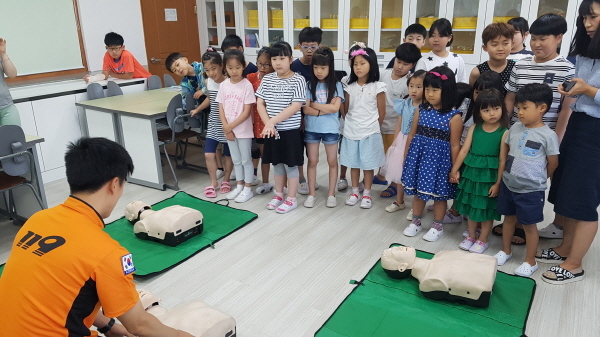 이날 교육에 참여한 초등학생들이 초롱초롱한 눈망울로 소방대원의 심폐소생술 시범을 지켜보고 있다.