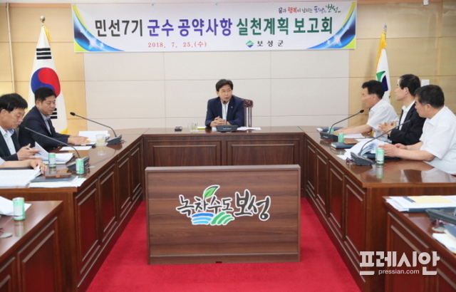 민선7기 군수 공약사항은 더불어 행복한 복지보성 실현, 다함께 잘사는 농림어업 육성, 군민중심 공감행정 구현, 미래를 키우는 교육환경 조성, 특색 있는 문화체육관광 실현, 편안한 정주여건과 지역경제 활성화, 권역별 균형개발과 시설 확충, 총 7대 공약 72개 단위사업으로 구성됐다.