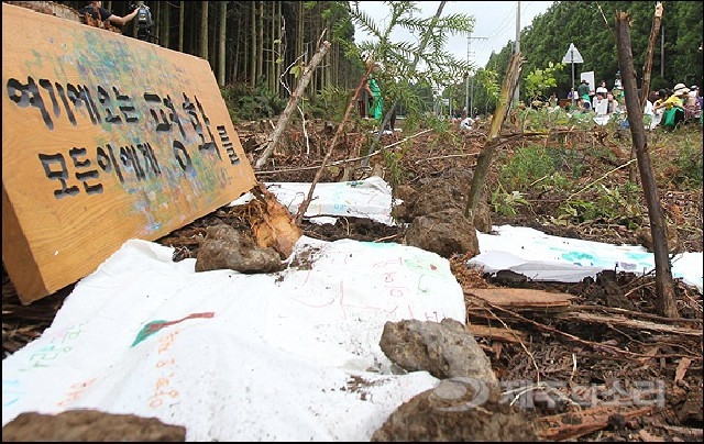 공사 과정에서 환경단체를 중심으로 반발이 거세지자 제주도는 삼나무 915그루를 벌채한 상황에서 최근 공사를 일시 중단했다.
