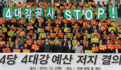 | ▲ 지난 2010년 '4대강 예산 전쟁'에 앞서 야당이 결의 대회를 열고 있다. ⓒ연합 |