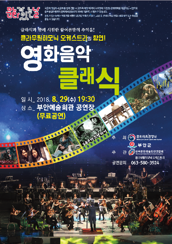 부안예술회관은 2018년 문화가 있는 날–작은 음악회 사업에 선정돼 추진하는 ‘영화음악 클래식’을 오는 29일 오후 7시 30분 무료 공연한다고 밝혔다.