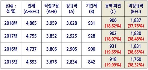 아래 표는 2015년부터 올해까지 고용형태 공시 결과를 바탕으로 작성해본 것이다. 상시 300인 이상을 고용하는 사업체가 각 연도의 3월 현재 고용 규모를 공시하도록 하고 있다. 즉, 2018년 자료의 경우 올해 3월 현재 정규직·기간제·용역·파견 노동자 고용 규모를 나타낸 것이다.