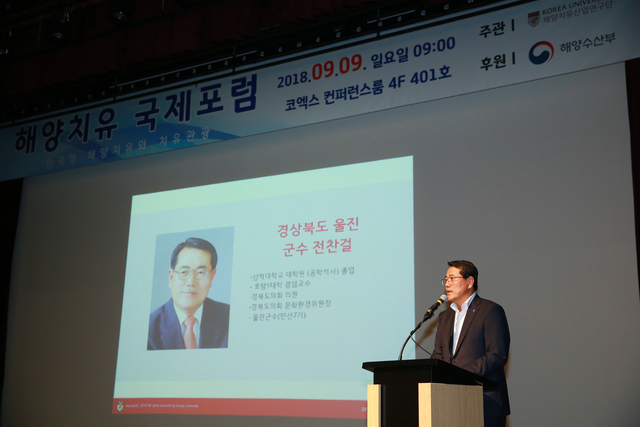전찬걸 울진군수는 포럼 인사말을 통해 “울진군은 청정해역과 더불어 통고산·구수곡 휴양림, 금강송 에코리움 등 삼림욕과 국내 유일의 자연 용출 온천인 덕구온천과 백암온천을 이용한 온천욕뿐만 아니라 해양치유사업 대상지인 월송정 주변 지역은 빼어난 해안경관의 해수욕장과 송림이 어우러져 있어 삼욕이 가능한 전국 유일의 지역으로 자부한다”며 “앞으로 국민들의 신체적⋅정신적 건강 증진을 위한 최고의 힐링⋅휴양 여건을 갖춘 국민건강 1번지로 육성 발전시켜 나갈 것”이라고 밝혔다.